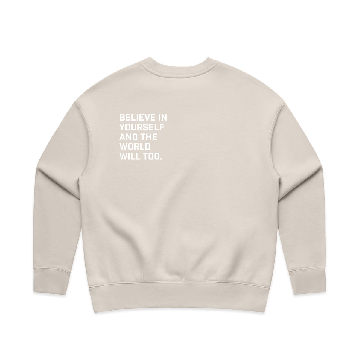 Woven with love—for our community and our planet. This cozy relaxed crew saves approximately six 500ml plastic bottles from landfill, while giving back to children through the Love, Jayne Foundation. A hand-stitched chenille heart rests over your own, and a quiet quote on the back reads: "Believe in yourself and the world will too."