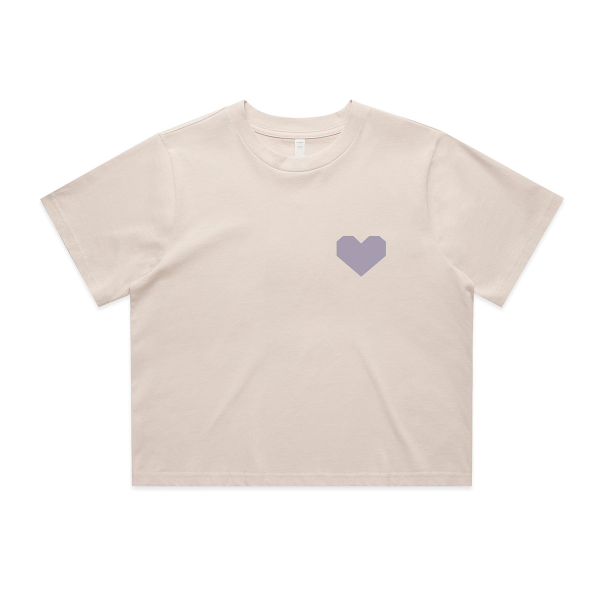 Lightweight, flattering, and full of meaning. This cropped tee is made from buttery soft fabric and finished with a screen printed purple heart over the chest. Sustainably made and community-powered, it’s a small piece that carries a lot of love.